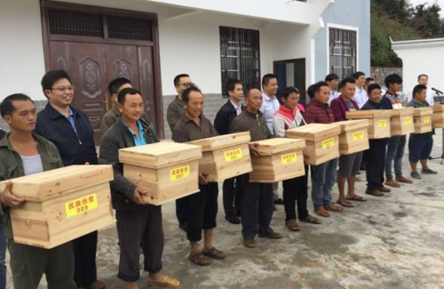 启动仪式现场向旺子村贫困户代表捐赠蜜蜂蜂箱、蜂群