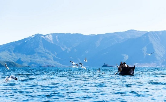 (泸沽湖如一块巨大的蓝宝石镶嵌在群山之间,澄澈湖面倒映格姆女神山的倩影,“东方女儿国”秘境令人心醉。图源:摄图网)