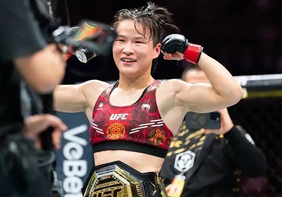 ▲2025年2月9日,张伟丽在连续第三次卫冕UFC女子草量级金腰带后庆祝胜利。胡泾辰 摄