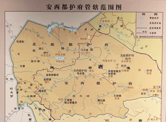 ▲安西都护府管辖范围图。图片来源:《五星出东方——和田历史文物展》