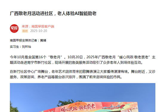 今年10月是全国第16个“敬老月”。10月20日,2025年广西敬老月“暖心民政·敬老崇老”主题活动走进南宁市新竹社区,现场开展的各类服务活动吸引了众多老年人到场体验互动。